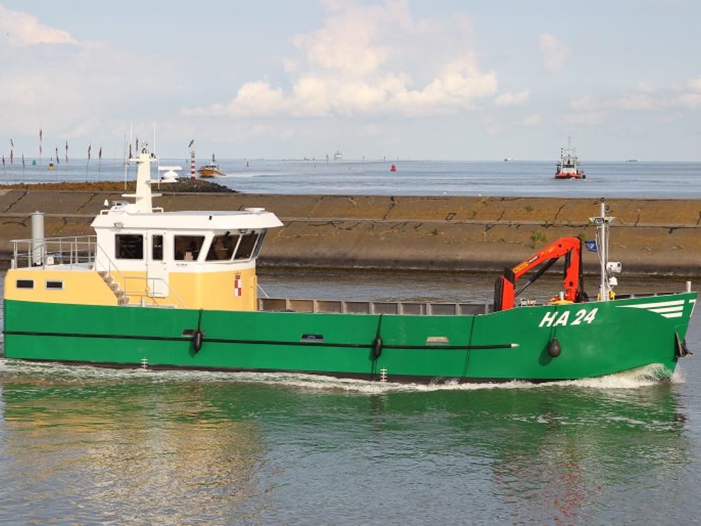 Due to the light weight of the boat, the boat is afloat much earlier than the usual heavy steel ships and can bring the heavy cargo back to the marina. A large cargo hold in the boat can store 20 tons of cockles in the water, so the cockles can stay of better quality. A heavy crane makes it possible to unload the ship in the harbor on its own.